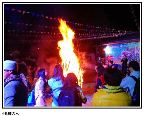 结束后,就是大家期待的篝火晚会啦。夜晚的景区有点凉意,篝火晚会的举办让所有参加活动的达人们都兴奋起来。欣赏云南身怀绝技的佤族阿哥阿姐们精彩绝伦的表演,参与主办方设计了的精彩游戏,达人们热情高涨,纷纷加入到游戏互动环节中来,抢凳子、肚皮舞、用叶子吹奏、跳竹竿舞,玩的不亦乐乎,直呼过瘾。