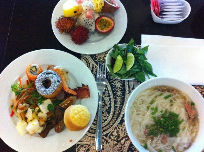 早餐实在是丰富的不得了,有限的几天旅行中,因为早餐太丰盛,反倒是没什么吃小吃和水果的兴趣。水果、糕点、饮料、寿司、沙拉、越南米粉、各种热菜、乳酪、酸奶 = =不但数量品种丰富,味道也十分可口。
