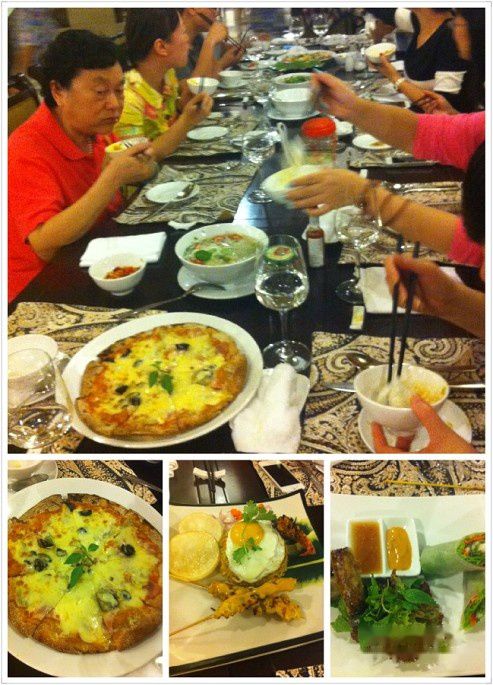 傍晚忽然下起了大雨,提着大包小包不好行走逛街,只好折回酒店,可这雨下的没完没了似的,只好到酒店用晚餐。好笑的是,这么大个五星级酒店,居然就我们一桌用餐,而且菜色也不丰富,无非是披萨、炒饭、春卷、米粉、烤虾、肉串之类,不过味道还是满正,食材新鲜,用料考究,清淡却入味,吃的很欢快。