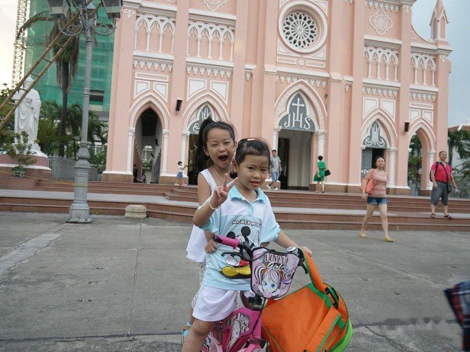 教堂外,给可爱的越南小妹妹留恋拍照一张,全球V字手,来,茄子。