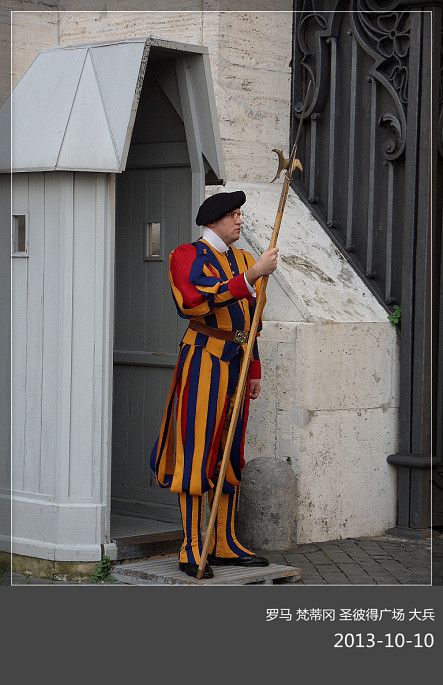 我唯一感兴趣的手里拿着斧头的瑞士大兵,他们身穿红黄蓝三色条纹的古代骑士服装,手握长戟,威风凛凛。据说在16世纪初教皇受到了神圣罗马帝国的进攻,为了保卫教皇,100多个瑞士卫兵战死在教堂外,当时的教皇非常感动,于是决定世世代代雇佣瑞士卫兵保卫教堂。