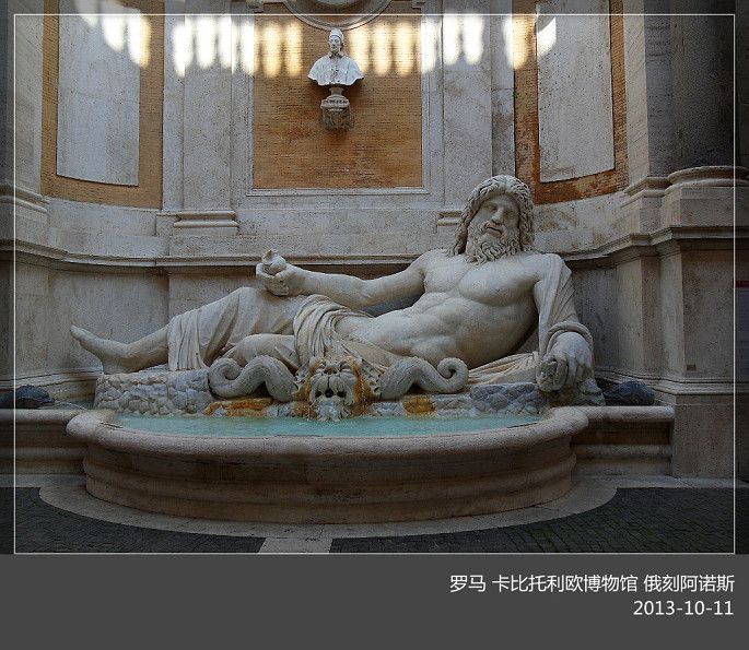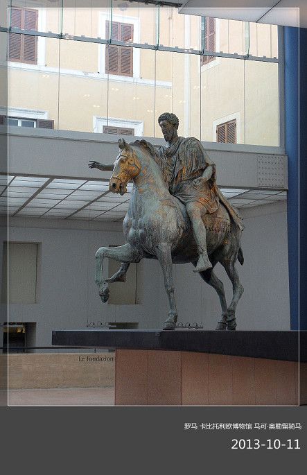“马可·奥勒留骑马雕像”,一提到这位皇帝,可能没人知道,但一提到《沉思录》,恐怕不少人都听过,这本书曾是前总理温总理的床头书。马可是古罗马五贤帝的最后一位,是一位哲学家,勤政爱民,最终劳累过度,死于征途中。这位伟大的皇帝死后干了一位最大的错事就是传位于自己的亲生儿子康茂德,而此前的皇帝都是传位于有能力的养子,结果安东尼王朝就此走向灭亡。而博物馆前面的广场上雕像就是它的防制品。