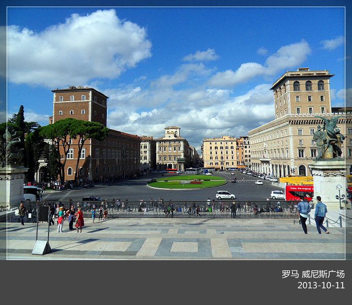 从卡比托利欧博物馆出来,就是威尼斯广场,在来罗马的火车站,有位驴友妈妈极力推荐,这里是罗马的中心地带。图中广场右侧是威尼斯宫,这是一座文艺复兴时期的哥特式建筑,在威尼斯共和国繁荣时期,这里曾经是威尼斯大使馆所在地,因此有了这个名称。臭名昭著的墨索里尼曾经从2楼的阳台向广场上挤满的人群发表了著名的“阳台演说”。