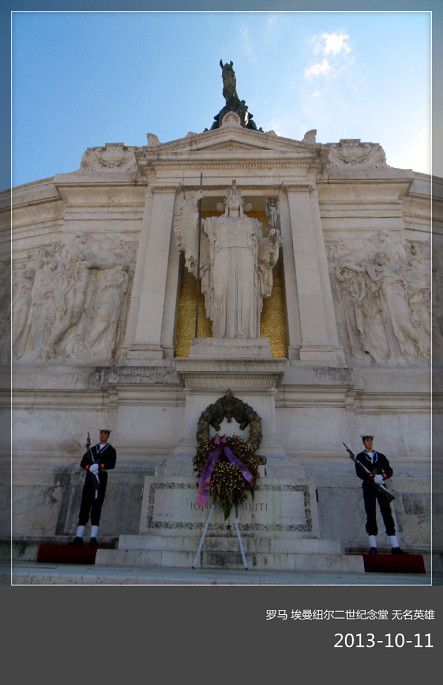 正面就是为纪念意大利统一而做出杰出贡献的开国国王维克多·埃曼纽尔二世纪念堂。纪念堂还有两个绰号叫“结婚蛋糕”、“打字机” 。纪念堂意大利国旗迎风飘扬,两名持枪的卫士守卫在无名英雄墓前。墓前摆放着花圈,上方是高大的胜利女神像。