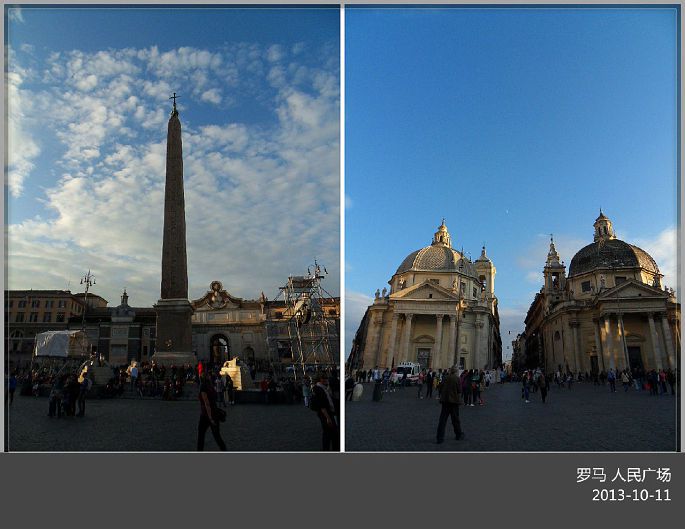 人民广场曾是公开执行死刑的地方,因前面有一个人民圣母堂而得名。广场相比上海的人民广场显得有点小,我觉得咱中国人太多了,那么小的广场根本容不下多少人。人民广场南面还有两个双子教堂东边的为圣山圣母堂,西边的为奇迹圣母堂,具体可参考big_michael所著的《双城记——罗马佛罗伦萨精读14天(超详解26教堂+24名胜古迹+7博物馆+蒂沃利+庞贝)》之