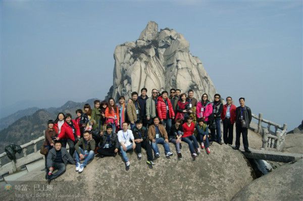 到达天柱山主峰景区,游览了峰顶晶莹剔透的雪、天外飞峰飞来峰、惟妙惟肖的象鼻石、鬼斧神工的皖公神像、幽深莫测的神秘谷、耐人寻味的和尚背姑娘、王母洗浴天池峰、千年古松天柱松、一柱擎天的天柱峰(海拔1498.8米)、中国第三大高山平湖炼丹湖(碧水如镜实难得)等景点。下面为天柱峰前合影留念: