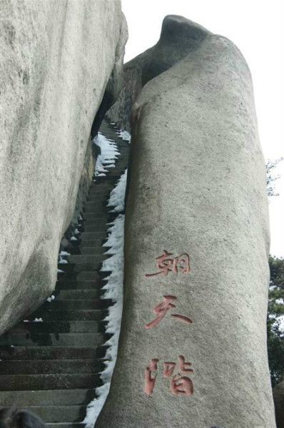 古语云:上山容易下山难。这话一点也不假。由于感觉双程都坐索道无法真正的体会天柱山的美,所以我们兵分两路下山,腿脚不适的坐索道返程下山,腿脚利索的就徒步下山,据导游说徒步下山台阶非常多,大约要1.5小时的路程,但是令人意外的是我们徒步下山的一拨人因为速度不一致,又分成了两拨,一拨人跟着导游在后面走,另一拨因为走错了一个岔道,又多走了接近十分钟的路程。由于三月的安徽下了一场大雪,所以我们有幸目睹天柱峰顶的雪景以及石壁背阴处的冰冻层被自然所雕刻出的绝妙景观。虽然台阶很滑,但是大家还是小心翼翼地,有条不紊地安全到达了山脚下的终点。下来后的第一感触便是”爽“!第二感触便是”累“!