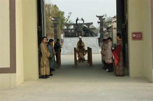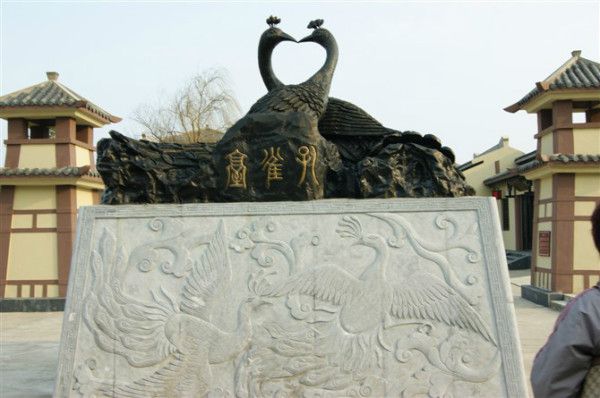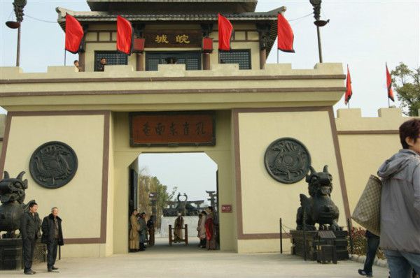 首先去游览《孔雀东南飞》影视城。一下车,首先入耳的是噼里啪啦的鞭炮声,接着映入眼帘的便是仿古的城楼,城门上方嵌有”皖城“二字。