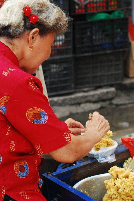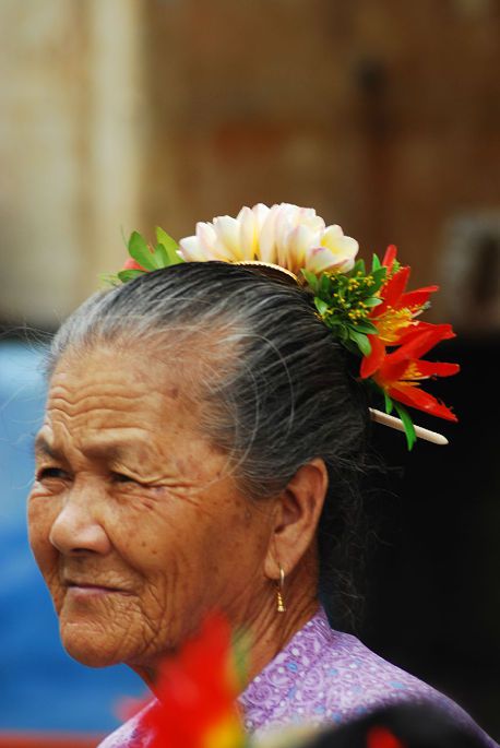 初到泉州,住在开元寺对面的小巷子里。因着泉州人的那份淳朴和友善,热情和笑容,已满满的溢满柔软,自然而然的生出这样踏实的感觉,一碗面线糊和咸饭,更让我们爱上这座城!朴实而生动。。。。下午的时光,去钟楼那里坐车,要觅的是一个叫做 蟳蜅 的东海小渔村;要看的是辛勤劳作的蟳蜅女和蚝壳堆砌的蚝屋。凭的只是那书上一瞥的图片,心里勾画的是一个年代久远的海边小村的模样。。。。蟳蜅女面容都是一般的久经海风的颜色,手指骨也多少有点变形粗大,那是由于她们常年在海边劳作的缘故。我们去的早,混在人流中看她们买卖抑或是分拣海鲜,她们也没有闲工夫打量我们这些外乡人。问起她们的头饰,才晓得,不是所有的日子都可以鲜花盛装盘头的,日日鲜花盘头的或是家中老人或者有大事,再就是妈祖的诞辰等等。。。。在许久的寻觅中,还是看见了已有年岁的婆婆,鲜花盘发的端坐。。。。那花朵密密匝匝,海风在她的额头刻下印迹