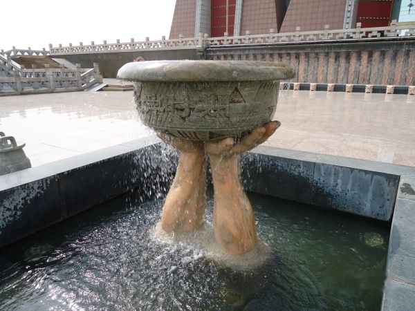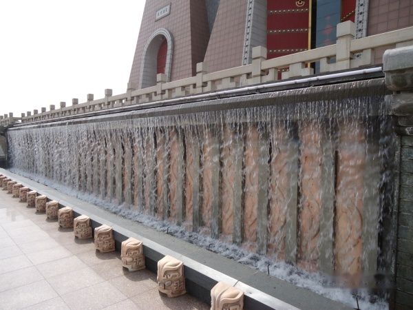 华门主门正前方有个瀑布墙,代表着孕育中华民族的母亲河——黄河。基座平台上方一双巨手托着一尊陶盆,陶器是人类由旧石器时代迈向新石器时代发展的重要标志,“巨手托陶”的石雕象征陶器在尧舜时期的文明地位。中间自上而下排列的21个彩球,代表自尧舜起共二十一个历史朝代。前面56级黄褐色的台阶代表着56个民族,寓意中华文明由各民族历经五千年共同创造。