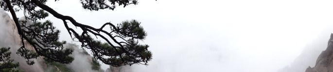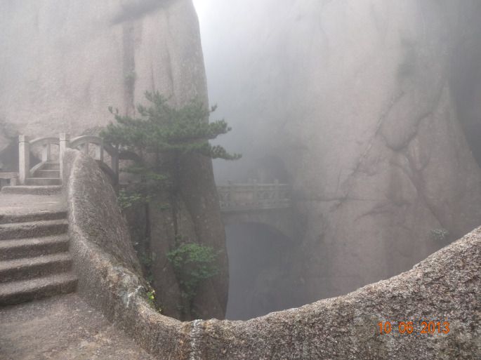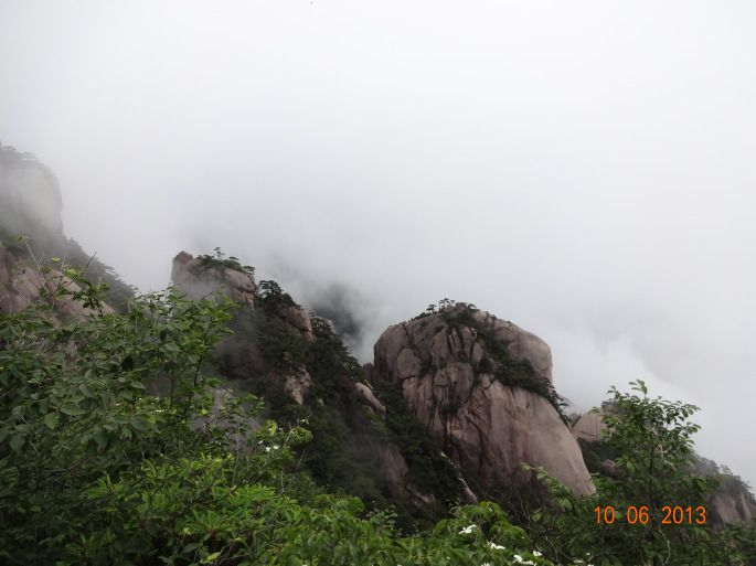 出了缆车,天气还是没有好转,浓雾中,黄山奇景之一的松树映入眼帘,与好天气时的绿意盎然不同,这时的松树在白雾映衬下显出深深的墨绿色,都说水墨黄山,应该就是这样的样子吧。个人还是很喜欢这样子的黄山,太亮的天气,一目了然太直接了。第一站是人人必看的迎客松,那是个大景点,照相都要排队的,当然大家还会想法设法开辟附近的留影地,一阵“咔嚓”留念后向下一个目标前进。这时老天开恩,一阵风把雾吹散了,灰白的岩体,翠绿的松色,出现在人们面前,真的美得无以言语。风一阵阵地吹来,浓雾也再次降临。游走在雾中,看不清远景,近景也是模糊的,倒有着寻仙访圣的感觉。不过,黄山有二点倒是出乎我的意料,山上没有看到什么庙之类的,题刻也不多。看来真真是看风景的地方。