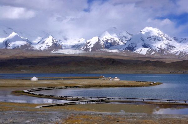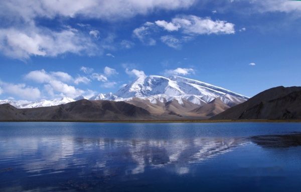 九月的南疆大地刚刚收获,金色的阳光轻轻地洒在维吾尔族的村落,也洒在戈壁滩上。从喀什出来,车沿着一条沟不停地走向深处,路两边的山岩看上去随时都有垮下的危险,因为这一带是泥石流多发地区,沿途很多处在修路,经过一阵车程后,哇,一片美丽的湖!湖名叫喀拉库勒,湖并不很大,但水很清澈,它的一边是是慕士塔格山,一边是公格尔山和公格尔九别峰,九座山峰都被冰雪覆盖,另一侧是公路紧贴着的荒山。正对慕士塔格山的湖边要收门票,我们未进去,绕到离景区远点的地方,站在湖边一阵狂拍狂秀。