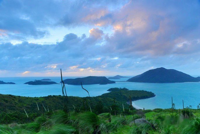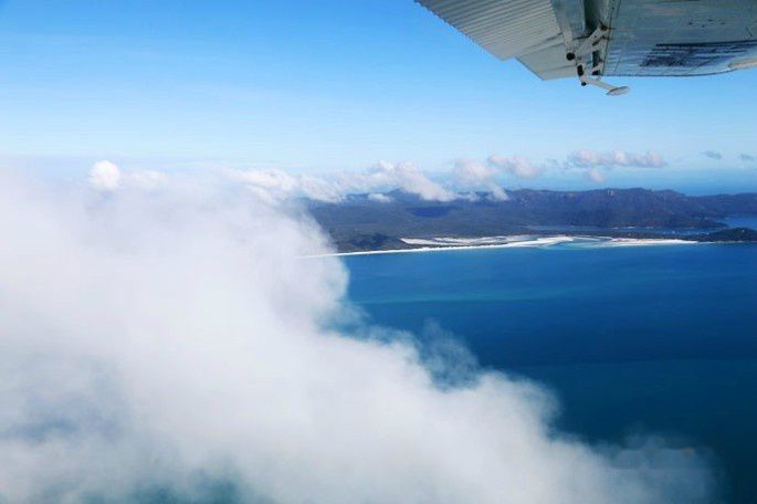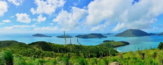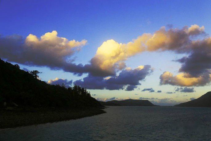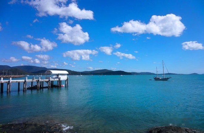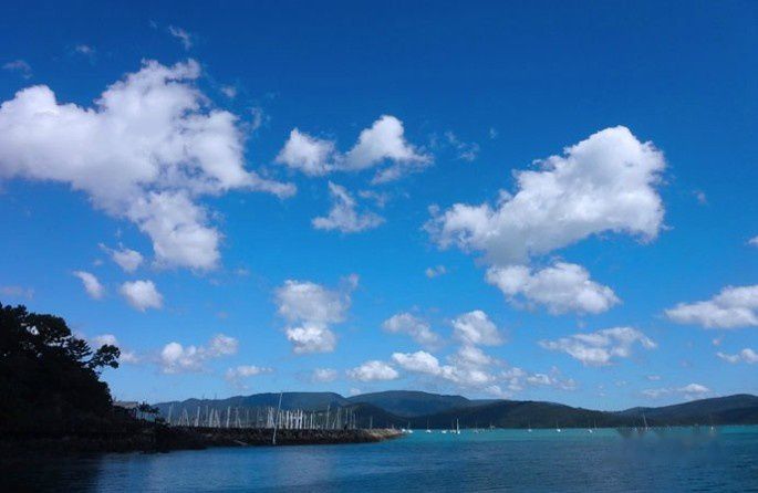 降落在目的地林德曼岛,无处不在的蓝色白云震撼着我的视觉。天空耀眼的蓝,变幻飘逸的云朵肆意地勾勒着多姿多彩的图案,心突然就变得空旷,宁静,舒缓下来。