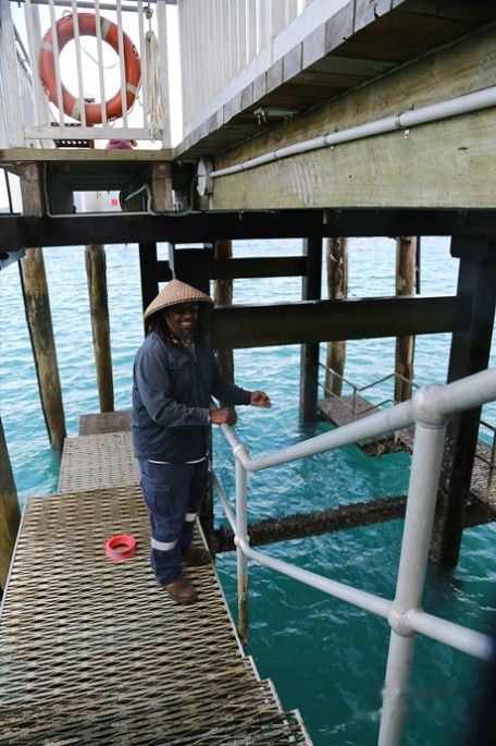 傍晚散步到林德曼岛码头,遇见岛上的一位土著工作人员在钓鱼。奇妙的是,他居然不是用鱼竿,而是徒手拉着钓鱼线,他这样能钓到鱼吗?
