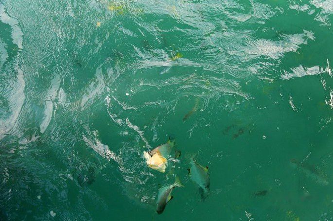 原来他先往水里扔了些面包,逗得好多鱼儿过来觅食。