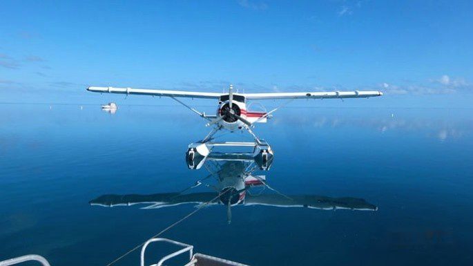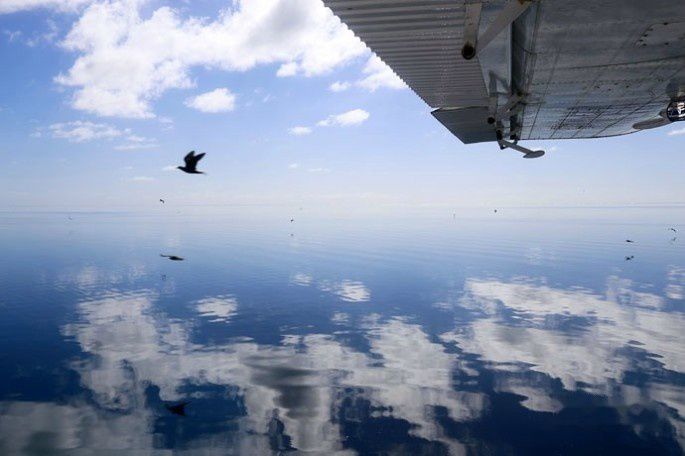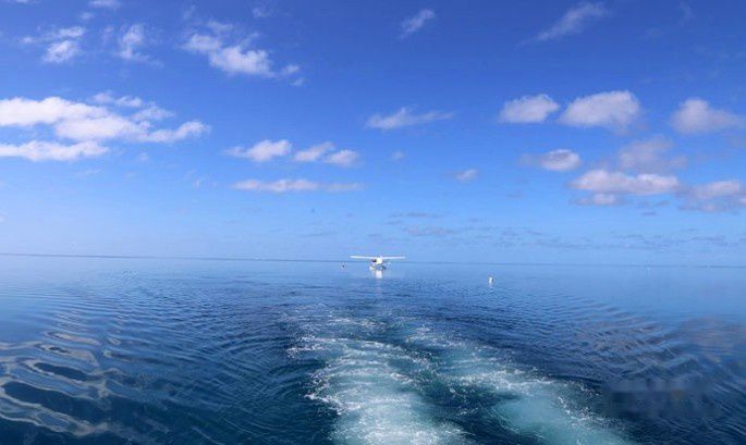 飞机停靠在私人潜水平台边,平时栖息在这里的鸟儿掠过海面。