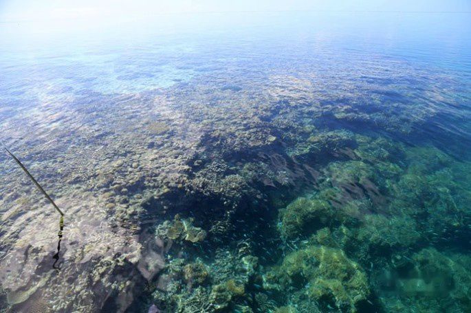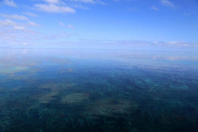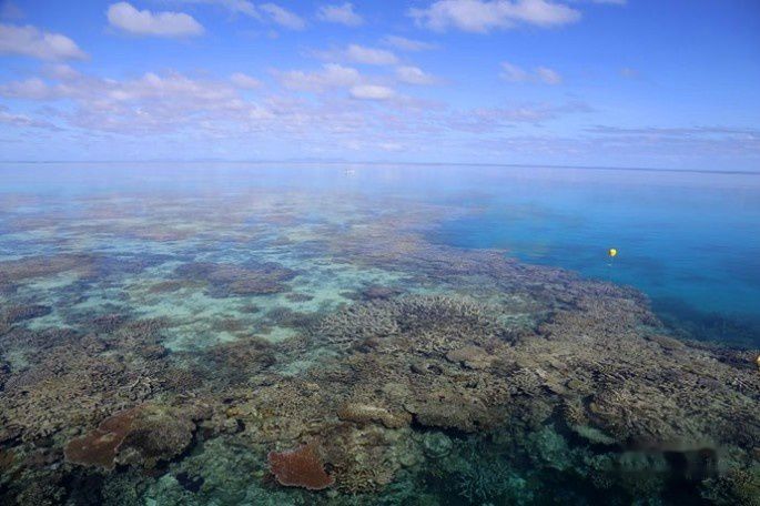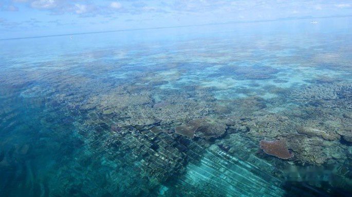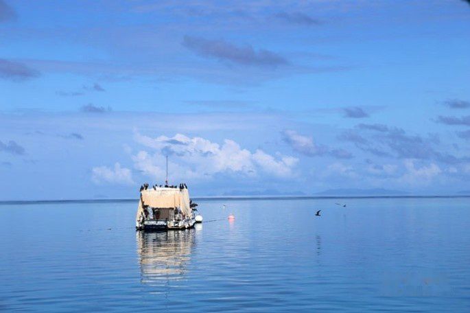 这个私人潜水平台其实是一艘停靠在大堡礁核心地区的游船,它带着我们驶向大堡礁附近,这里浮潜才有绚丽的珊瑚礁和穿梭其间的鱼儿。海面清澈见底,珊瑚礁清晰可见。