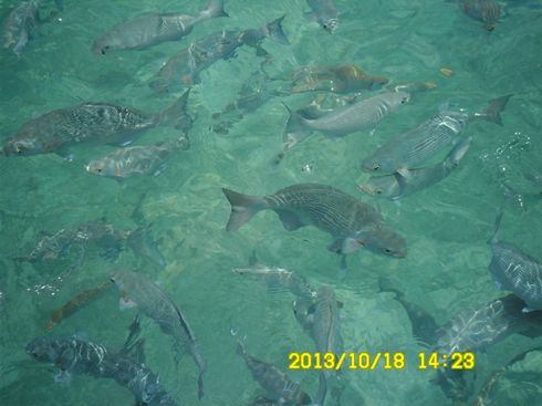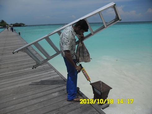 溜达到昨晚栈道处,那透明的海水呈现出湖蓝色、浅绿色,那颜色的纯净清澈、晶莹剔透给人一种非常不真实的感觉,不像水,倒像是一块涂了染料的画布(请看维修工人那张照片)。活动在纯净透明空气中的人们、含珠带露随风摇曳的绿树、停泊在码头的纯白色海豚型游船都好似在画中……