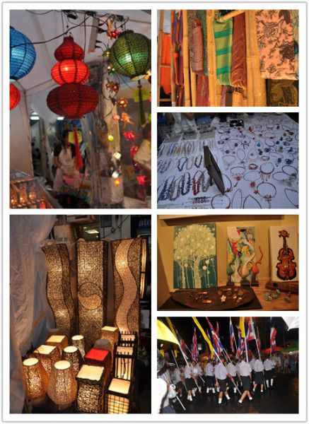 坐的地方离周末夜市走路十分钟样子,塔佩门附近。周末夜市是来清迈的旅行者大都推荐的,因为聚集了好几公里长的小摊贩队伍,卖各种各样的工艺品,吃的、穿的、玩的、用的都可以找到,东西很便宜,新鲜芒果汁25bath一大杯,有辣得爽口的木瓜沙拉,印度薄饼,有泰式风格的各种灯具,正好当天清迈有庆祝活动,所以也见到各单位的人在集市上挥着旗子行走。