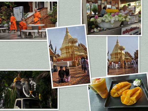 大饱水果餐后, 下午租了辆双条车(tuk tuk嘟嘟车),去素贴寺有些远。谈好价从12:00-17:00,500b.玩完后再给钱,在想难道不怕我们三人中途跑人?^_^,三人平摊还挺实惠。车子直接开上车,在山中途,司机会停几分钟,因为可以瞰看整个清迈城,其实没啥好看的。上到素贴山顶,可以步行走台阶也有缆车直到素贴寺(50b)。10b买支莲花和香,拖鞋进庙祈福。本来要绕着金色的神庙走三圈,可太阳真的很大就放弃了。祈福在于心中。停留一个半小时后下山到清迈大学,去吃了大家推荐的 Mango tango 甜品店,个人觉得一般,一杯芒果汁好像要70b,一整个芒果既然120b,还不如在Sunday Market吃的。