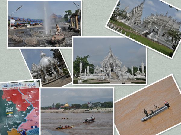 丰田小面包车式的来guesthouse接送。可坐14人左右,8点钟出发,1个半小时后到达hot spring,没啥好看的。只有几个蓬头在冒,可以用温泉水煮几个鸡蛋当早餐罢了。停留半小时后往白庙走。大概1小时后抵达(11点左右)。白庙还是挺漂亮,但估计工程浩大,精雕细琢出来的艺术品。停留半小时后继续前往金三角,正好下过雨,河里一片混浊。停留1个半小时,幸好没买船票观光。在周边走走,拍拍照也就罢了,风景实在一般。大概14:00左右返回去吃自助午餐,倒是菜还挺丰盛。
