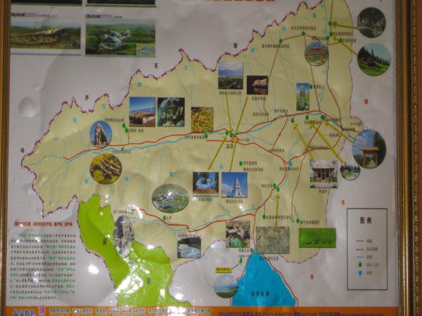 难得的一张温泉县旅游景点地图,由于时间紧张,我们只转了县城内的景点,包车去了西边的阿敦确鲁石头城、石墓群岩画、北鲵自然保护区、冷水鱼基地几个景点。