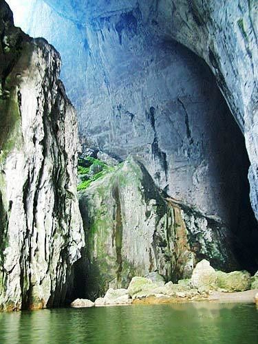 到格井苗村,就能见到前方高高的山上一个大大的穿洞。大穿洞下方一个116米高、25米宽的巨大拱门里,就是格凸河伏流入口燕王宫,泛舟进宫,是长277米的地下湖,湖的尽头,塌陷的洞顶形成一个直径200米、深370米的巨大通天洞,阳光从倾斜的洞口洒下,照见碧绿的格凸河水。响彻洞厅的格凸河水前行潜入12公里长的燕王宫幽暗处,沿河深入7公里可到达苗厅。沿通天洞斜径攀援而上,可见燕王宫、通天洞、大穿洞三洞共一片蓝天白云的神奇景色。穿过大穿洞,走过方竹林,来到一个平台,是一个条形凹地,长约1公里,这是早期地下河顶板崩塌后形成的,地质学上称盲谷,四壁是三四百米高的绝壁。