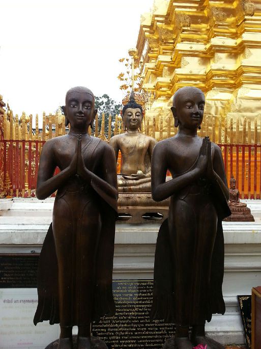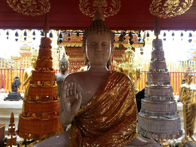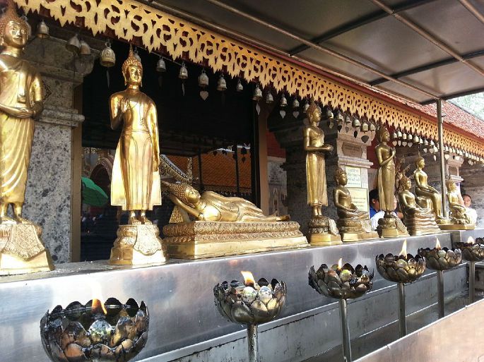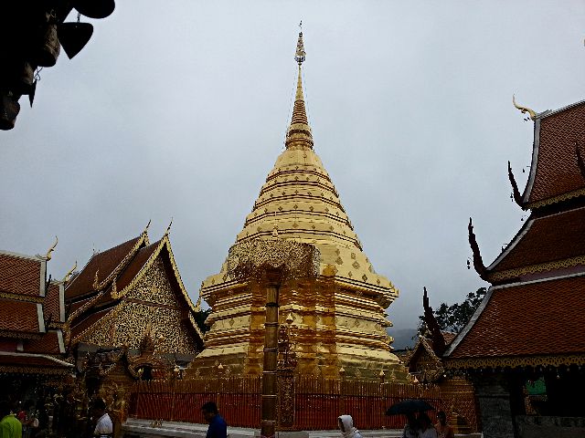 清迈泰国第二大城市,有着“泰北玫瑰”的雅称。素帖寺,又称双龙寺,是游人必到之处,上山的306级台阶让有些人叹气。主塔贴满金箔,塔顶甘露由36公斤黄金铸成,下面镶有999颗以及9种颜色的宝石各一颗。进寺必须着长裤或长裙,以及有袖子的衣服(最好素净一点),必须脱鞋。手持莲花一朵、蜡烛两根,围着主塔顺时针转三圈,点燃蜡烛,献上莲花,祈福消灾,但愿在天有灵!