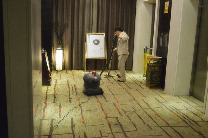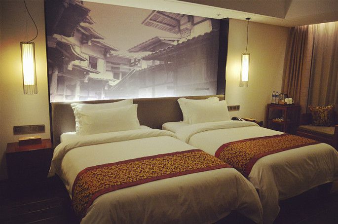 和同事住双人间,整个酒店弥漫中国风,复古的吊灯,木质的柜子、花瓶瓷器的摆设。