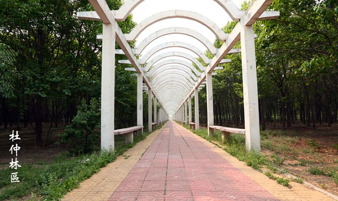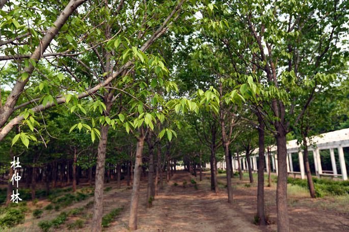 『杜仲公园』内种有7年生名贵药材杜仲树近三万棵,及公园辅以银杏 樱花 丁香 黄栌 石榴 金银木等乔灌木的绿植。为了体显公园的机能又在树下套植了芍药 牡丹 月季等植物茂密品种繁多。同时园内又建有人工湖,理顺人工渠,小花园,绿荫长廊及健身场地。道路纵横通幽达静,非常适合休闲,是一处自然清新的郊野场所。