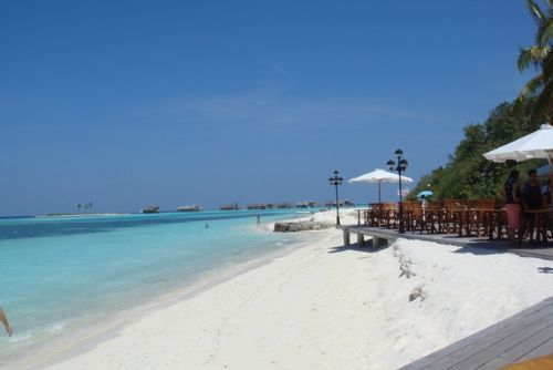 房间很大,装修也挺舒服的,尤其是推开阳台门,外面就是一个大露台,直接面对海边。从房间一出去就是沙滩。走几步就到海里了。匆匆整理洗漱后终于可以躺倒床上休息了。我梦寐以求的马尔代夫旅行开始了。