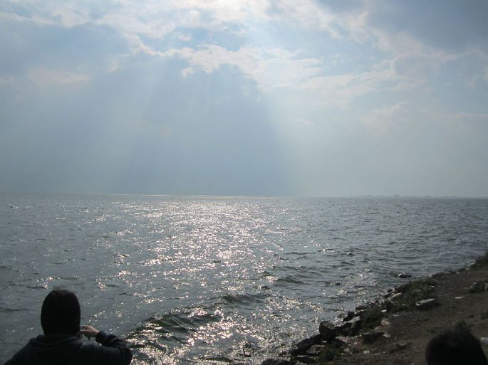 骑到半路我们到了一个公园,走上阶梯上面有一个湖很美,里面还有人在游泳呢,清澈见底的湖水