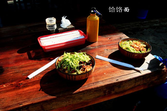 来此地游玩吃饭不用愁,景区安排的即周到又方便。农家饭很受欢迎,明码实价。我吃的压饸饹10元一碗,是白面,玉米面,荞麦面,榆皮面,绿豆面五种面粉混合压制而成(不知相互比例),饭碗个不小。