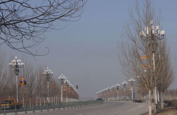 进入五常市的大街上工人们正往路灯上挂迎接春节的灯笼。