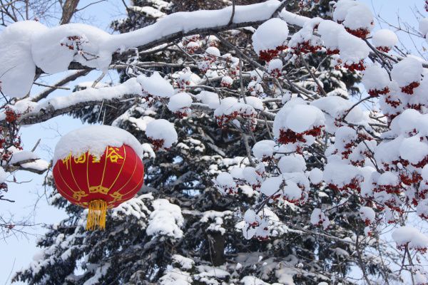 大大小小的红灯笼给白色的冰雪世界增添色彩。