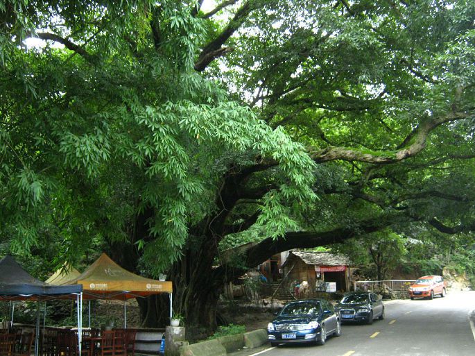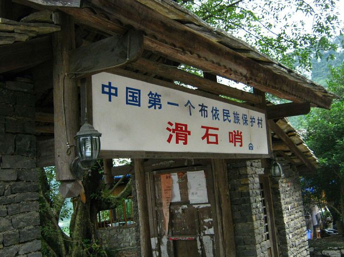 下一个风景区是天星桥,这里有介绍,拍一张片子后,便顺流而下。沿途风光无限,虽然是下坡,自行车一路下滑,但还是不忍错过好风景,一路走走停停。最值得一说的是,途中有一棵大树,像一道走廊,覆盖整个公路。这就是滑石哨——中国第一个布依民族保护村。