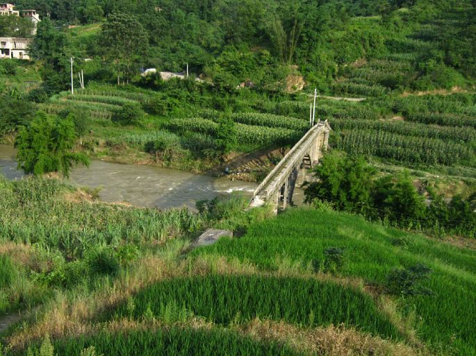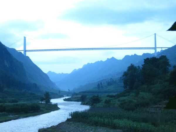 到天郎线的终点,连接的是320国道。在三叉路口遇到一当地女孩,聊天中知道附近有坝陵河大桥,明天有国际跳伞比赛,便临时改变计划,晚上住当地断桥镇,明天去看坝陵河大桥和国际跳伞比赛。