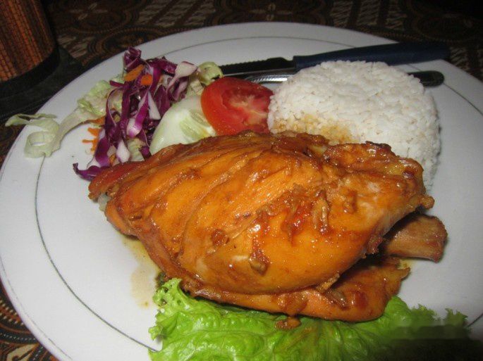 然后开始在附近逛。找到一家老外很多的饭店吃饭。印尼特色的菜肴类似于盖浇饭,饭上放点肉,放点生的菜,放几片龙虾片,再浇点花生酱。很甜。味道特别,还好不觉得难吃。
