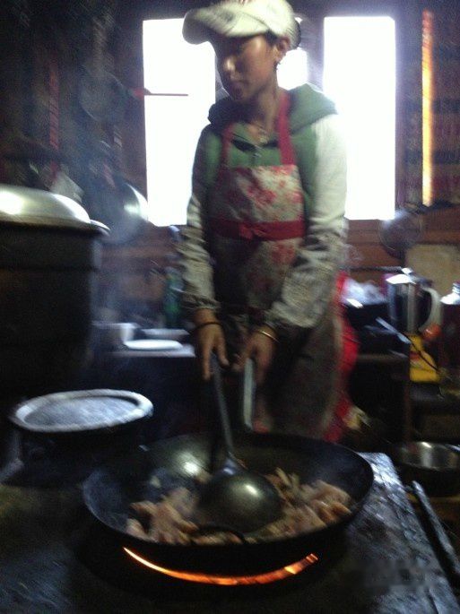 多吉的妹妹格桑在为我们煮好吃的,因肚子饿了看她一人忙不过来,想帮忙加快速度。不让我们动她家的厨具,说是当地风俗规定谁动了她家的厨具就要留下做她家的媳妇。格桑真的好幽默。