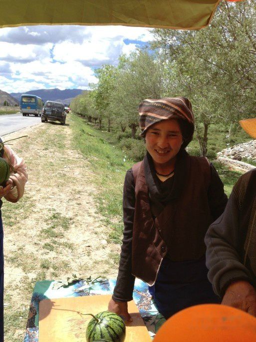 路边女孩跟着父亲卖西瓜一脸羞涩,可已是两孩子的妈。十五岁结婚。想想十五岁时的你还在干嘛?西藏西瓜真的很好吃又爽又脆又甜。