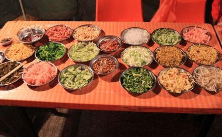 丝娃娃就是将面皮裹上桌上的不同的菜和调料吃。一般以10个面皮为一份起价。