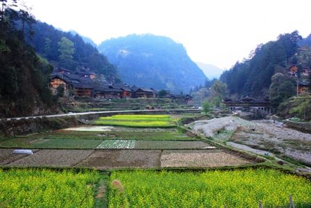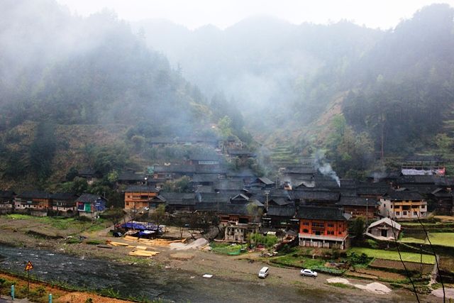郎德上寨全景,左边是进寨的路,右边是风雨桥,前面的空地就是班车停靠点。