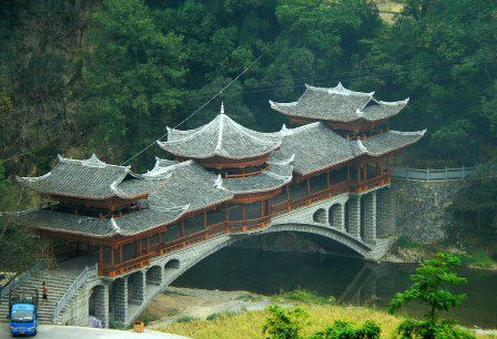 整个风雨桥的架式,都是以杉木为主要的建筑材料,也不用一钉一铆,全是木料凿榫衔接,横穿竖插,通常都是由桥、楼、塔、亭、门组成。建筑的造型,主要是以侗族的鼓楼,苗族的吊脚楼形状建造而成的,不仅风格很独特,建筑技术也很高超哟!