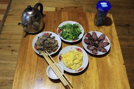 在侗寨转了圈,原想赶去黎平的车,等了半天没见车来只能再肇兴过夜了,找了家村口的旅店,想早上好赶班车。住肇兴古镇旅馆。楼上是客房,楼下是餐厅。 当然相比苗族,这里就显得脏,乱,也没东西好吃。让老板找了些野菊菜,及西红柿炒鸡蛋,加面条当晚餐了。