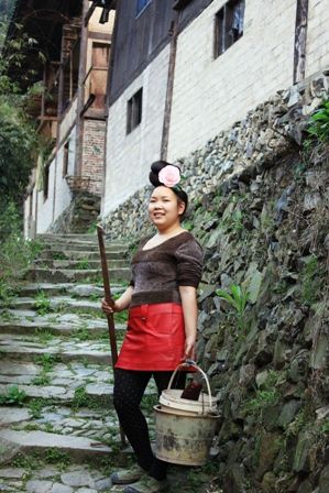 下午6点半左右到达山寨,在寨门口遇上摆摊的苗家妇女,家里住房接待游客的。