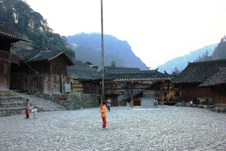地面是用鹅卵石铺成。一般如有旅游团来,全村人会穿上节日服装在广场表演当地的苗族歌舞欢迎客人。