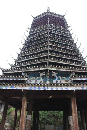 有侗寨的地方一定有鼓楼及花桥,所谓一桥一楼。侗寨建鼓楼,是吉祥的象征,兴旺的标志,由全寨人集资修建。鼓楼的作用有:一是侗寨的标志。二是侗族族姓的标志。三是侗族群众休闲的场所。四是年轻人社交的场合。五是接待客人的地方。六是集会议事的要地。七是传递信息或报警的工具。八、祭祀的地方,每年正月初八踩堂祭萨。