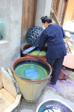 一路上可见侗族人住家前的染缸,染色池。