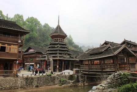 侗寨全景,5大鼓楼分散在村寨里。