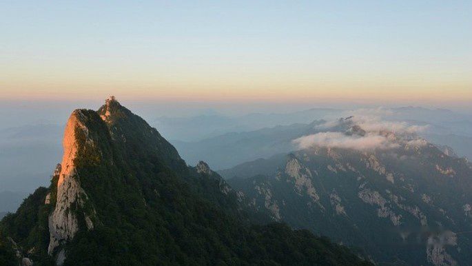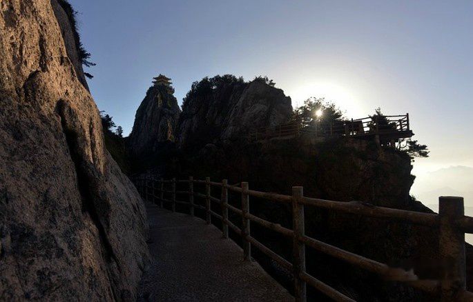 救苦殿右转,曲折盘旋,过舍身崖,经子房路、彭祖路、伯鸾路、观音殿、范公路一路向上,空气越来越清新,景色越来越雄伟,心情越来越好,队伍却越来越小,人数已不到出发时的一半了。在观景台上极目远望,但见群山隐隐,奇峰竖列,烟云飘缈,如画张展,令人心胸极扩,眼目震撼。沿悬空的栈道小心向上,站在渡云桥上,看烟云淡雾从峰后缓缓移来,从胸前荡过,人就置身烟云之中了。